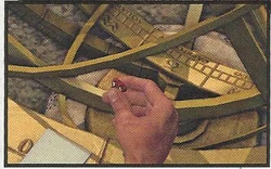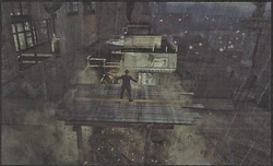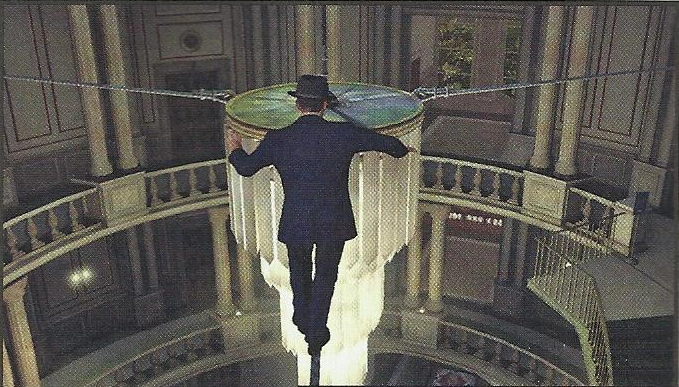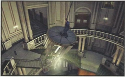 Oficina de Registro En esta ocasión tendrás que subir a la lámpara de araña del techo. Sube al piso superior y entra en un cuarto de mantenimiento. Allí habrá una escalera que llevara hacia una ventana, donde está enganchado uno de los tres cables de acero que sujeta la lámpara. Tendrás que guardar el equilibrio con el "pad". Una vez encontradas las pistas, la lámpara empezará a descolgarse y tendrás que balancearte hasta saltar a un sitio seguro.