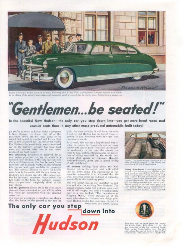 The Hudson Commodore was the first car ever to feature Hudson's well-published and trademarked "Step-Down Style" which made it unique of all automobiles of its era and began a new trend in auto-body construction. It is the precursor to the Fabulous Hudson Hornets, which would be first released for the 1951 factory year, famous for NASCAR racing.