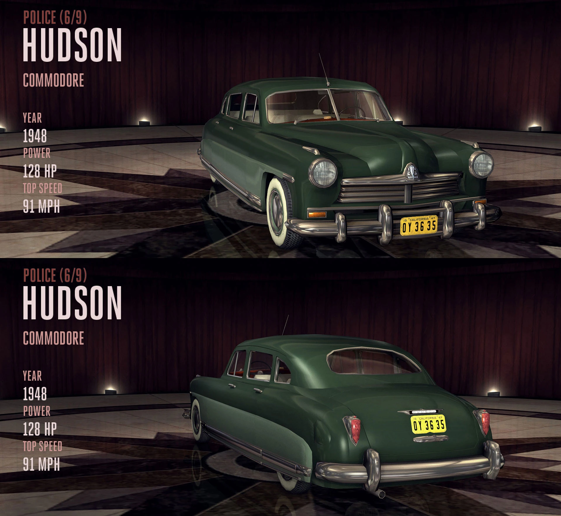 There is only one Hudson Commodore featured in-game, it is the police vehicle of Arson detective Herschel Biggs - featuring use of a siren and is unlocked in the first Arson Desk case, The Gas Man.