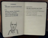 The notebook is an important piece of equipment used in all the cases. Cole uses the notebook to write down all the evidence such as clues found at the crime scene. The notebook can also be used to ask questions during interrogations and aditionally to review evidence during interviews. Description on persons of interest and Phelps current rank can also be seen on the notebook. Another feature in the notebook are the Intuition Points. It can be carefully used to help you by showing the most common answer after "Asking the Community" or "Removing an Answer", to obviously remove an answer.
